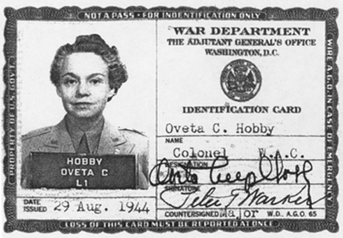 “Oveta Culp Hobby, U.S. War Department identification card.” (1944) Woodson Research Center, Fondren Library, Rice University: https://hdl.handle.net/1911/37099.